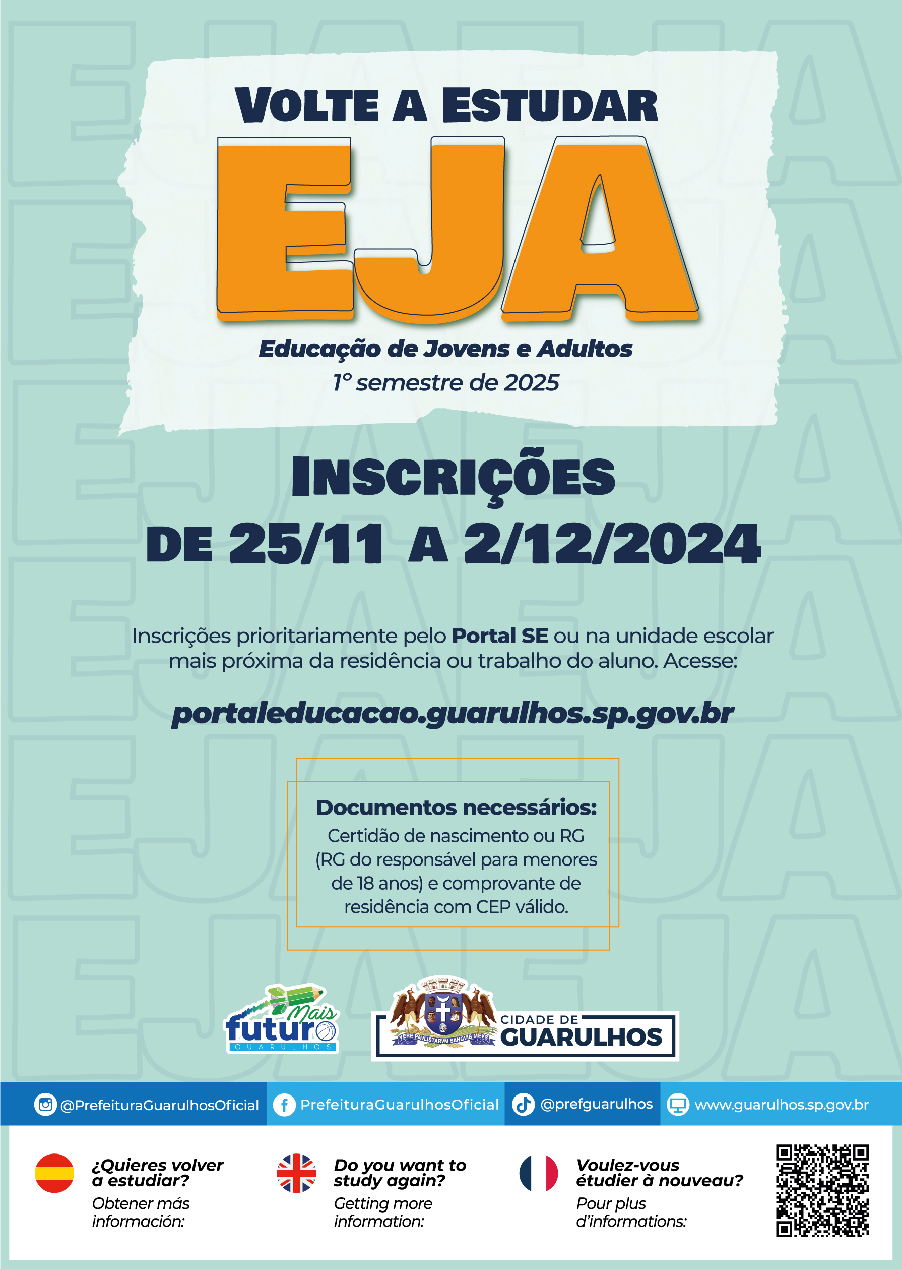 A partir desta segunda-feira (25) estão abertas as inscrições para novas turmas da Educação de Jovens e Adultos (EJA) nas escolas da rede municipal, com início no 1º semestre letivo de 2025. O período de matrículas segue até o dia 2 de dezembro para os interessados de forma online, por meio do Portal da Educação.