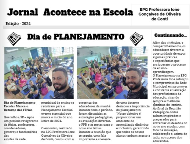 A EPG Ione Gonçalves de Oliveira de Conti, na região dos Pimentas, lançou a 1ª edição do jornal Acontece na Escola, veículo de comunicação estudantil desenvolvido pelas turmas do ensino fundamental durante as aulas-projeto com o objetivo de evidenciar as práticas pedagógicas da unidade escolar.