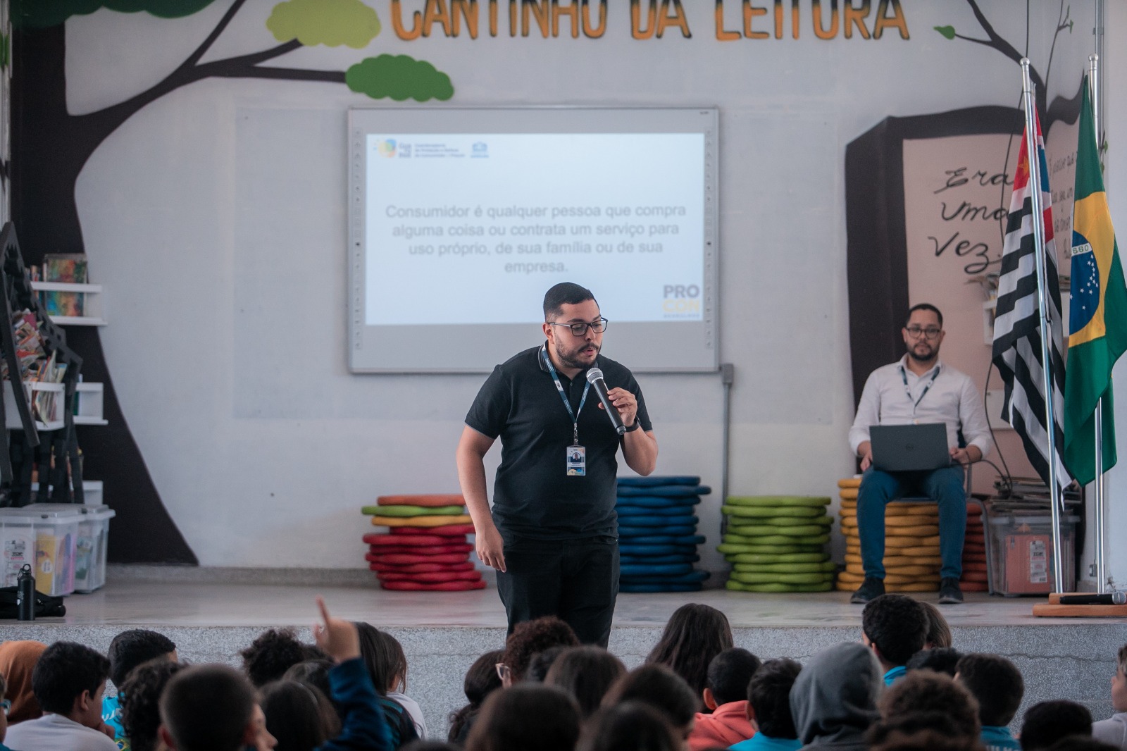 Realizado pela Coordenadoria de Proteção e Defesa do Consumidor, em parceria com a Secretaria de Educação, a iniciativa contempla 18 unidades escolares inscritas. No início da palestra, o responsável técnico do Procon, Henrique Dias, apresentou de forma prática como funciona a relação entre consumidores e fornecedores de produtos e serviços, por meio de uma simulação de compra com as crianças. A encenação serviu de exemplo para explicar a atuação do Procon em informar, defender e orientar os consumidores.
