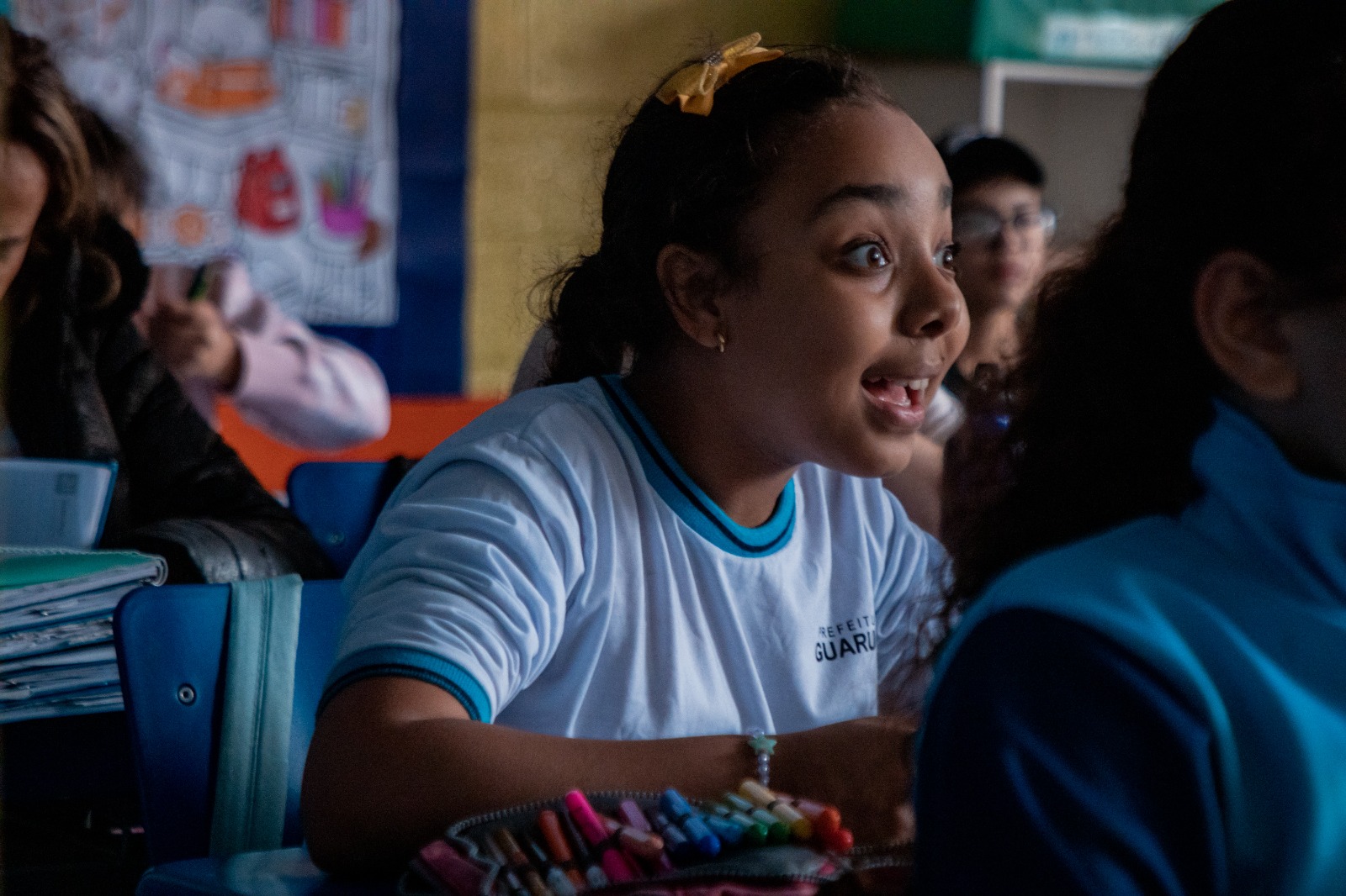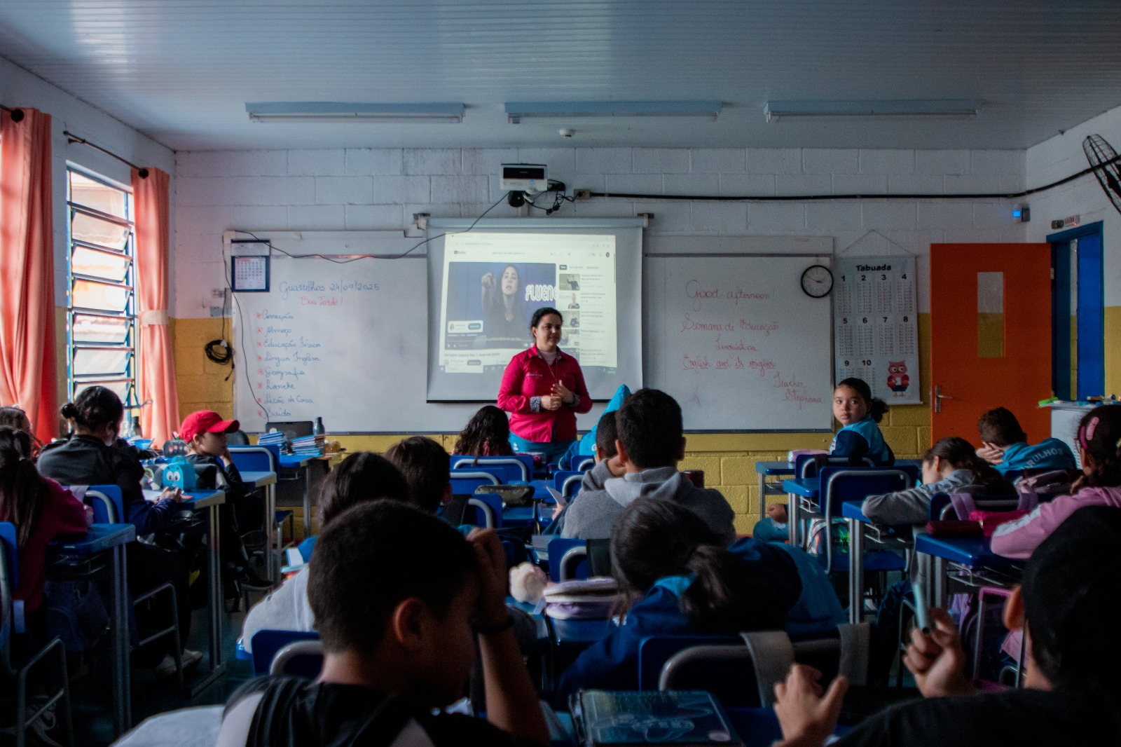 Nesta quarta-feira (24), a Semana de Educação Linguística promoveu uma ação descentralizada realizada na EPG Siqueira Bueno, no Jardim Vila Galvão. Os alunos do ensino fundamental participaram de uma aula especial com a professora de Língua e Cultura Inglesa, Stephanie Spósito, que apresentou de forma didática as origens da língua inglesa e suas influências históricas.
