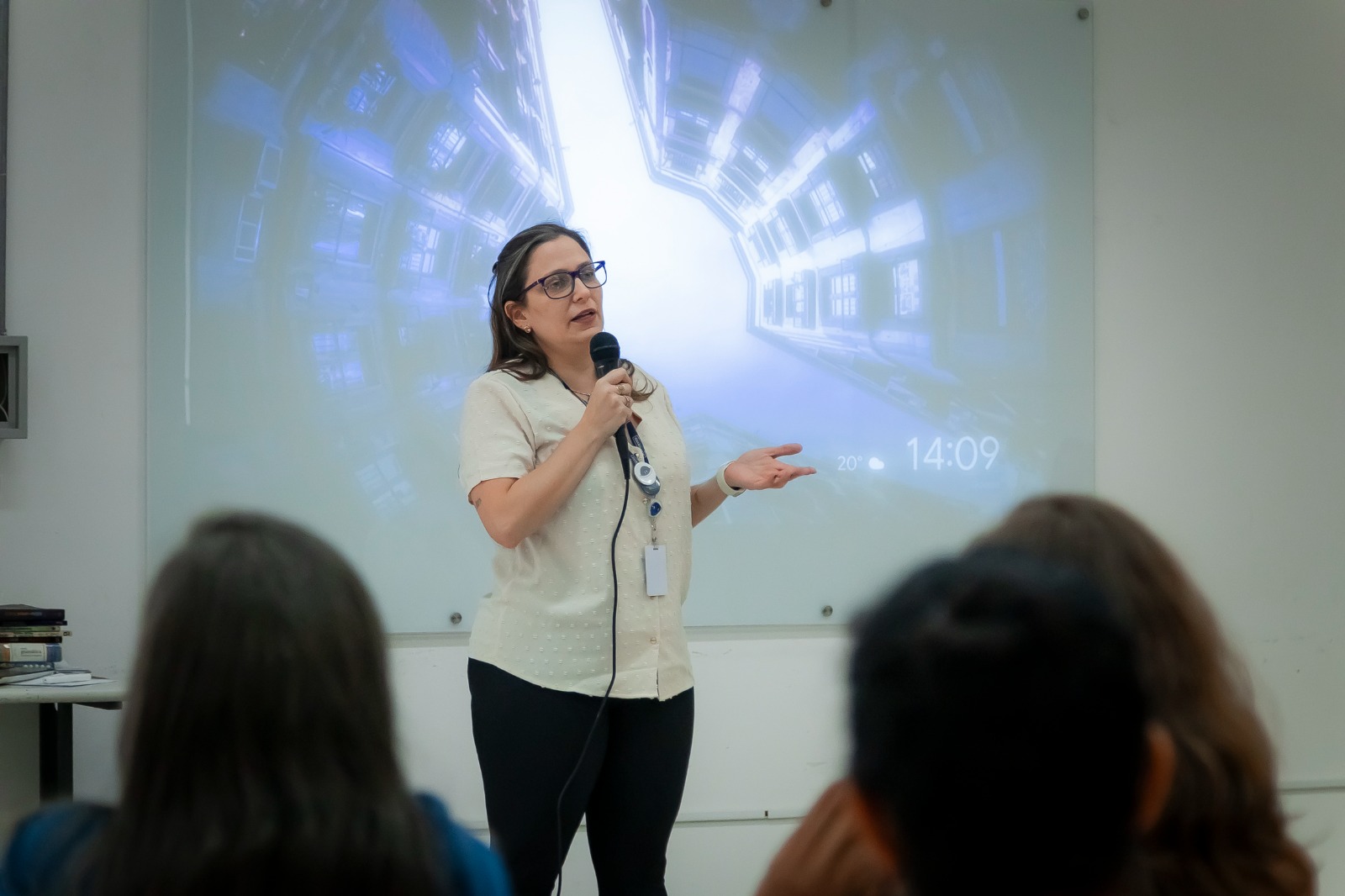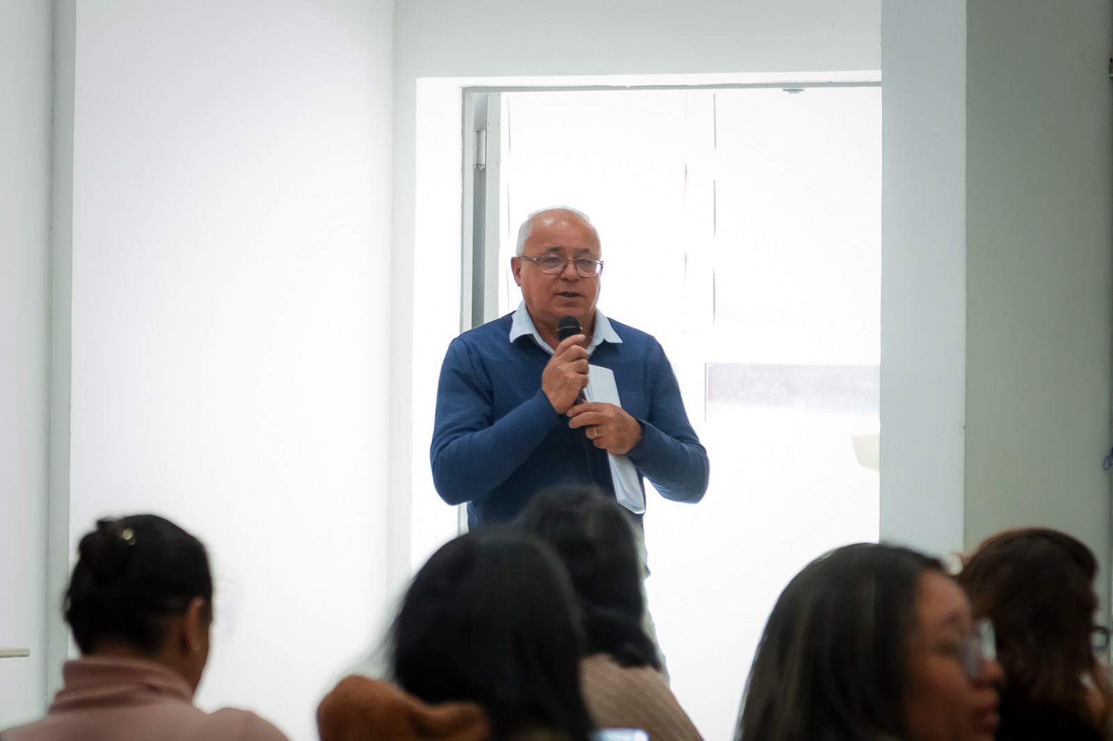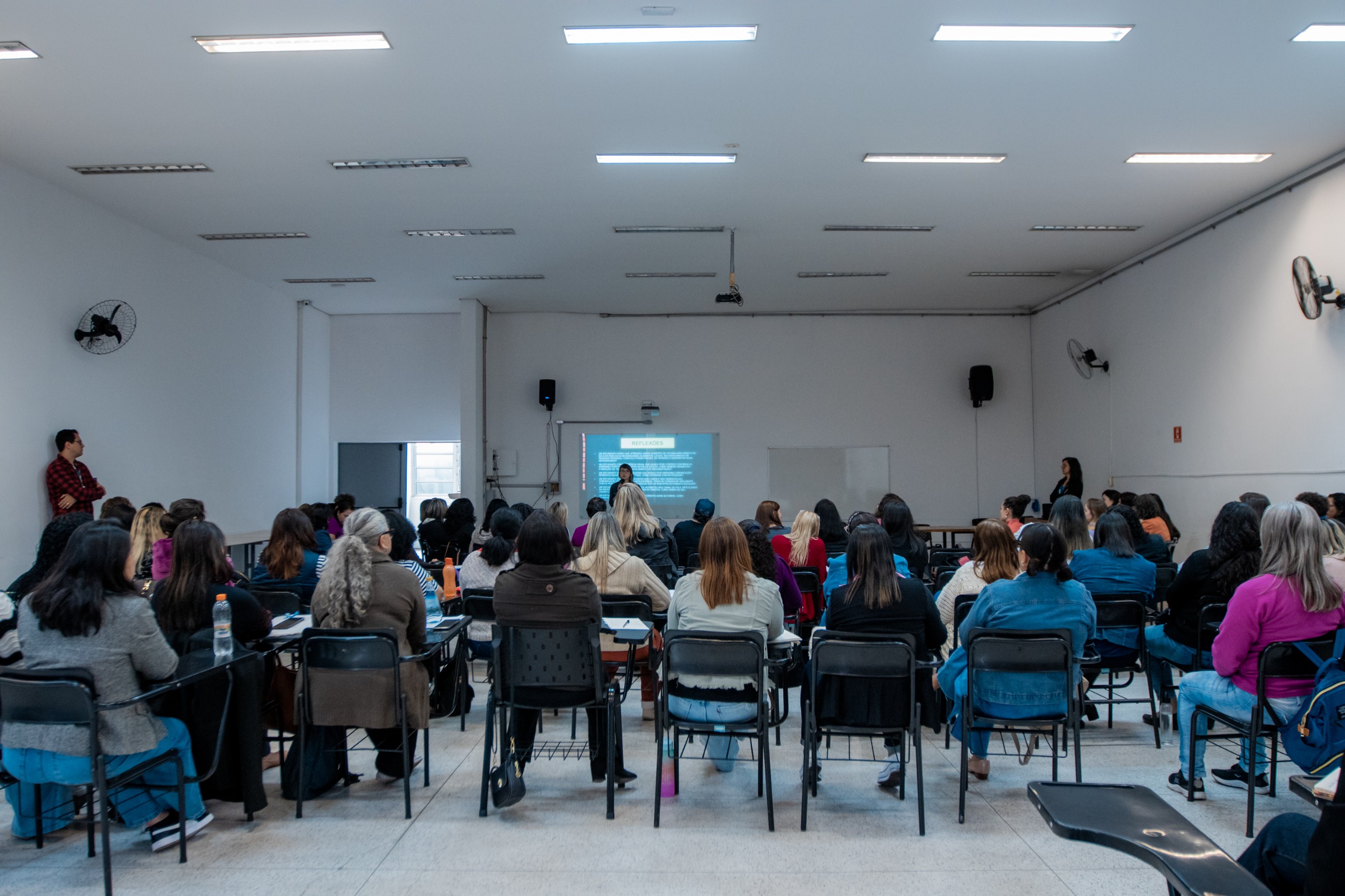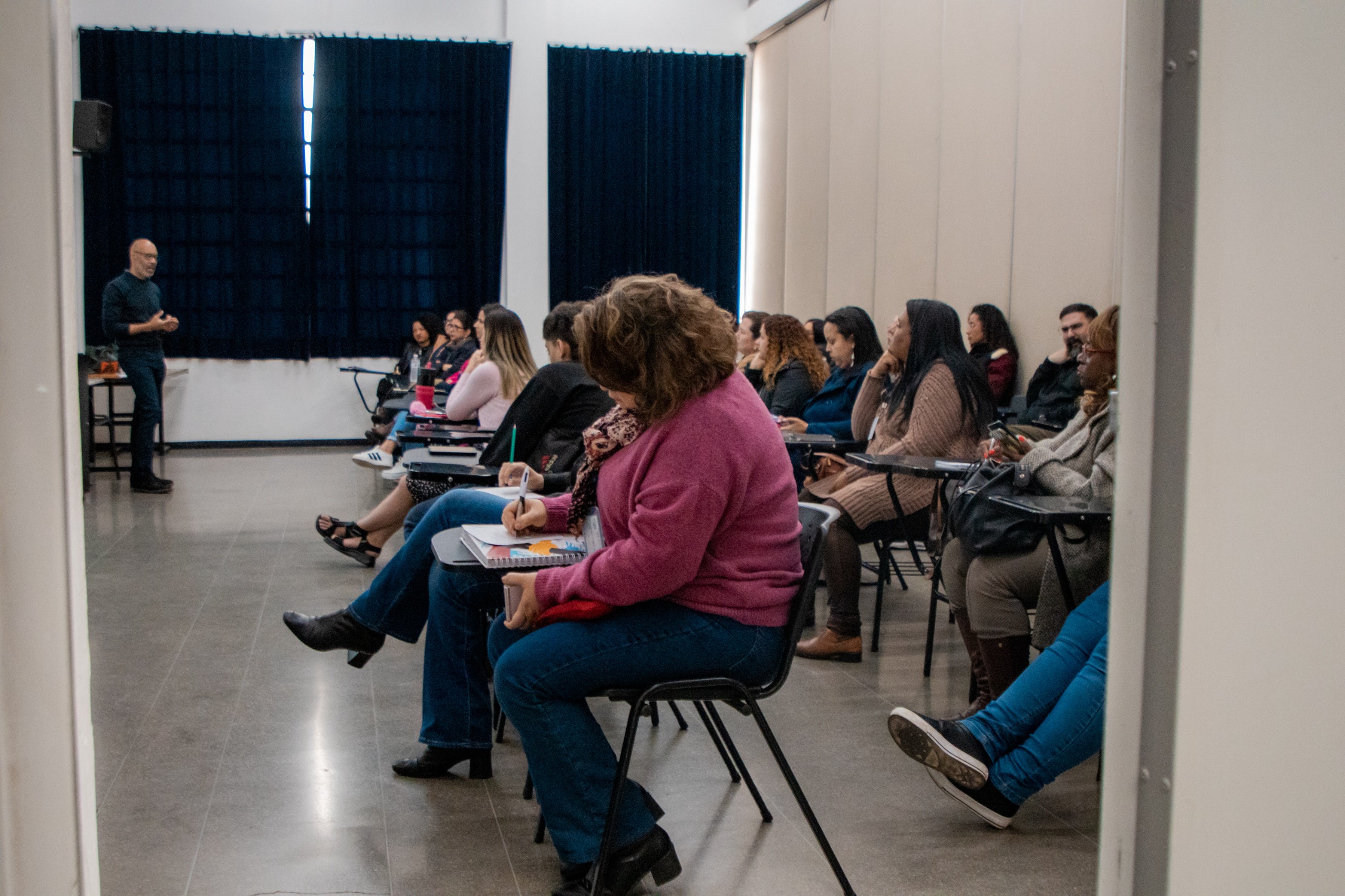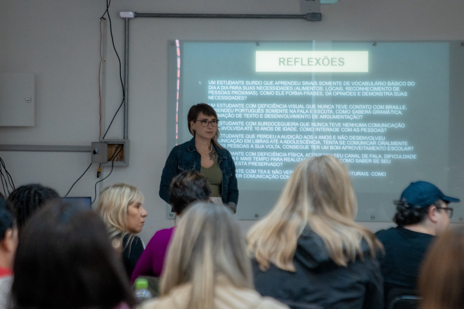 Na terça-feira (23), a palestra "Linguagem e cognição aplicados à sala de aula para estudantes com deficiência", ministrada pela profa. dra. Beatriz Cavalheiro Crittelli, com mediação de Rafael Miguel e Letícia Cunha, contou com a participação das professoras do Atendimento Educacional Especializado (AEE), professores da educação infantil, professores bilíngues e estagiários.
