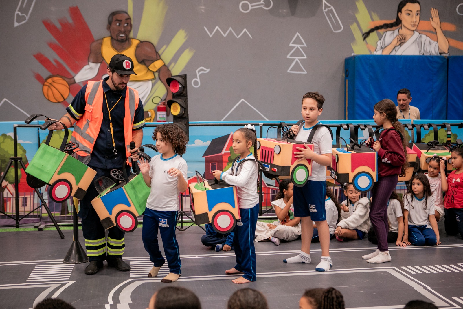 No encerramento da intervenção cênica, os alunos receberam uma simbólica habilitação como pequeno condutor de veículos infantis (bicicletas, motoca, patinete, patins e skate), além de um material didático divertido do projeto.
