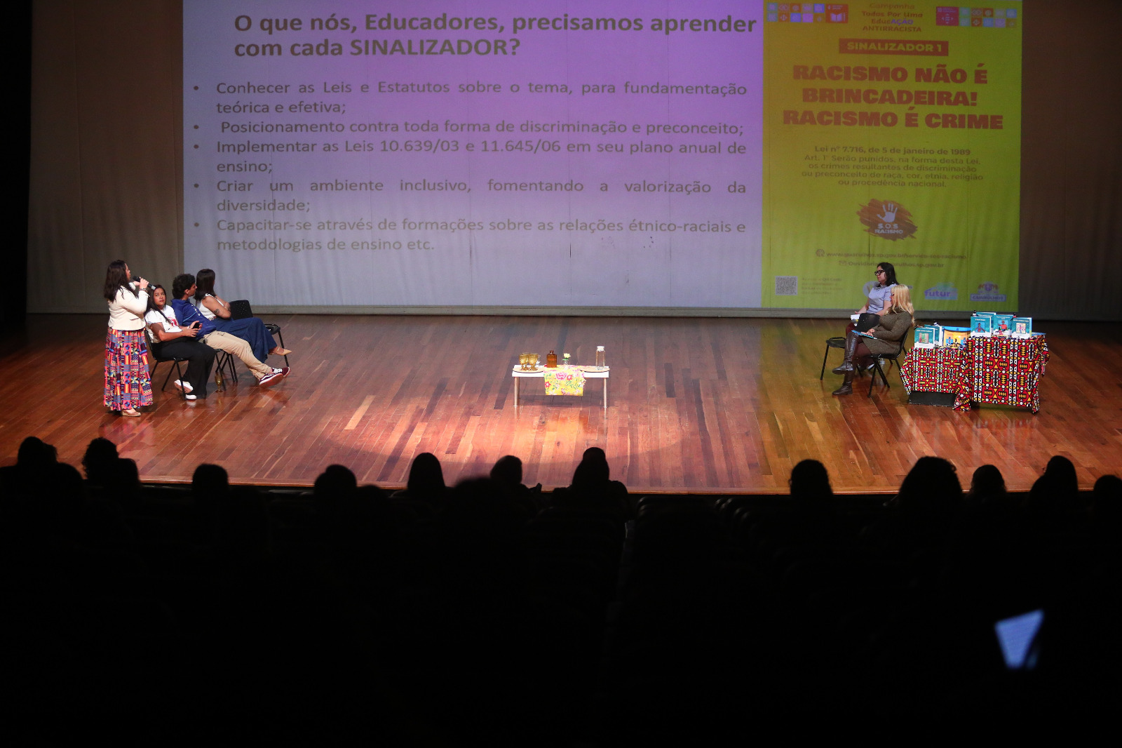 Na última quinta-feira (6), coordenadores pedagógicos e tutores do Programa LEIA se reuniram no teatro do CME Adamastor, durante compartilhamento de experiências de escolas que têm trabalho sistemático com a educação antirracista.