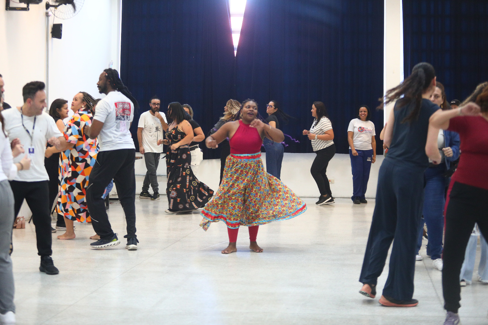 No período da tarde, a formação mediada pela professora Gleicy Lopes contou com a presença do Mestre Aurélio Baraka, professor de Educação Física da rede, que desenvolve trabalhos de capoeira nos CEUs de Guarulhos. Com o grupo, Baraka abordou o ensino do jogo de capoeira no ambiente escolar como arte, corpo e movimento.