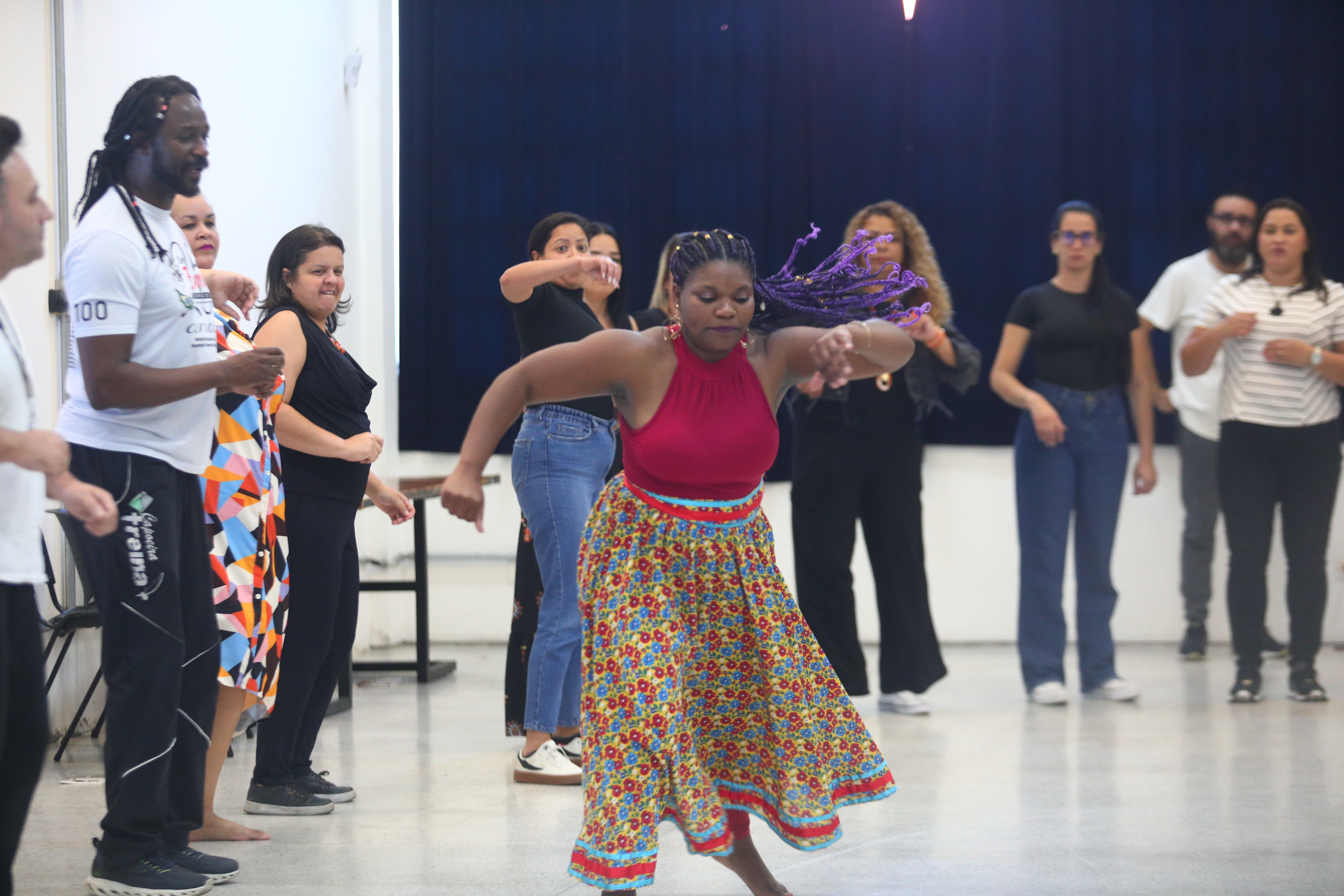 No período da tarde, a formação mediada pela professora Gleicy Lopes contou com a presença do Mestre Aurélio Baraka, professor de Educação Física da rede, que desenvolve trabalhos de capoeira nos CEUs de Guarulhos. Com o grupo, Baraka abordou o ensino do jogo de capoeira no ambiente escolar como arte, corpo e movimento.