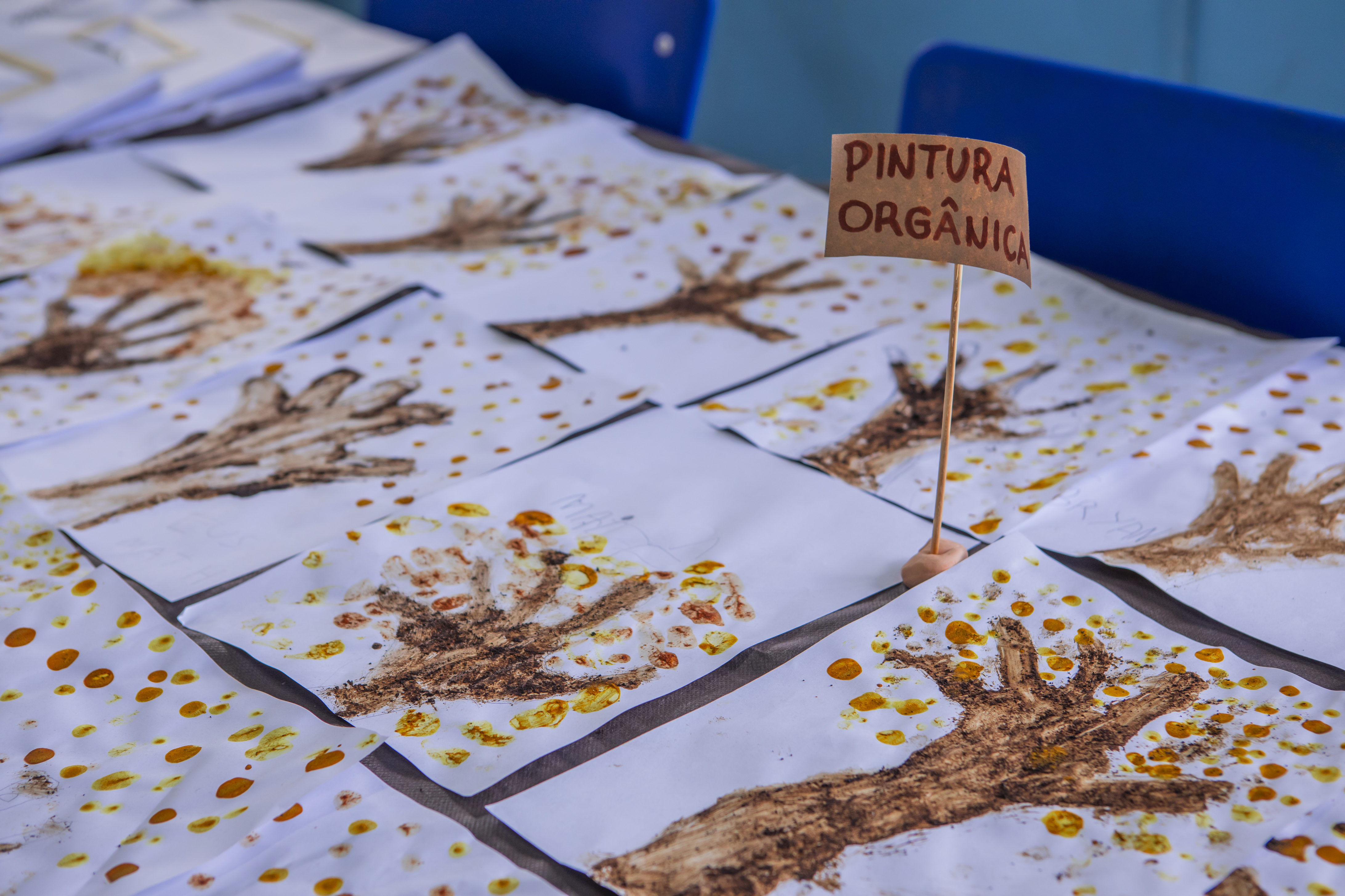Na sala da turma de estágio II da professora Maxwella Doca, o ambiente tranquilo e música serena convidavam as famílias a se envolverem em atividades artísticas que exploravam elementos da natureza como carvão, folhas e argila. De acordo com a educadora, esses materiais promovem a criatividade ao incluir a exploração de formas, como a simetria das folhas, pintura, desenho da natureza e autorretratos feitos com carvão.