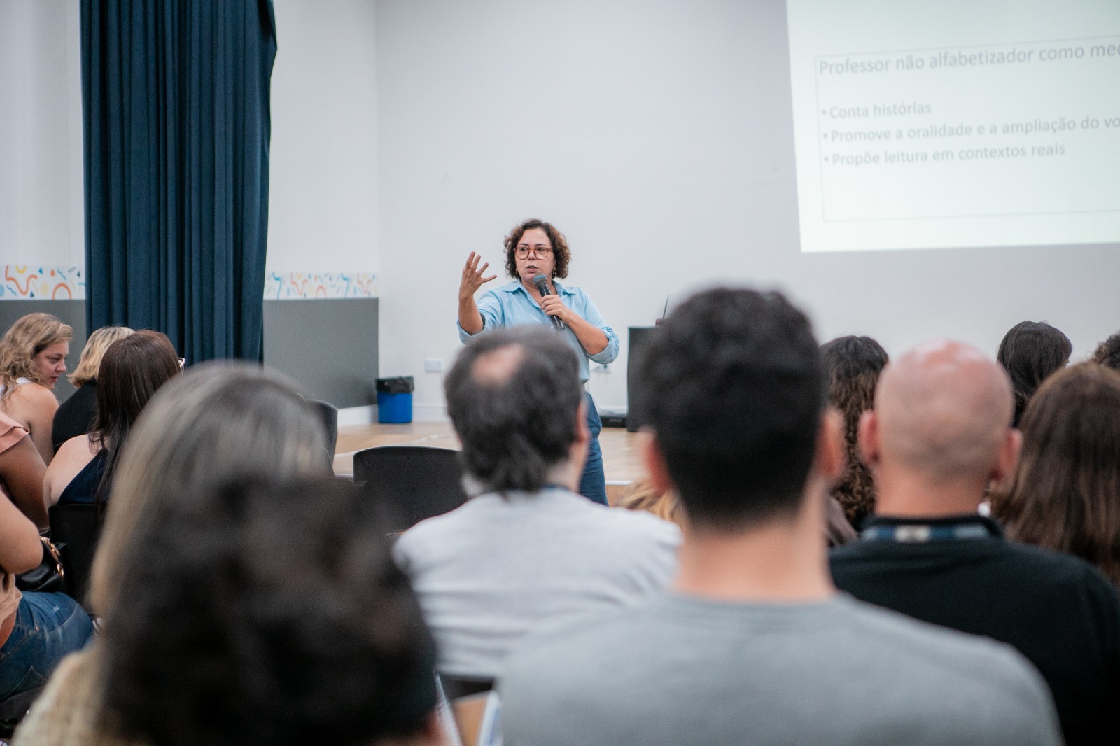 Com foco especial na linguagem e na leitura, a especialista em Educação destacou o papel do professor dos Centros Educacionais no contexto da educação integral, a partir do desenvolvimento de projetos interdisciplinares, da criação de espaços de leitura livre e da realização das atividades de teatro, música e dança. Entre as estratégias práticas que favorecem o contato significativo com a linguagem, foram citadas a leitura compartilhada, jogos de palavras e rimas.