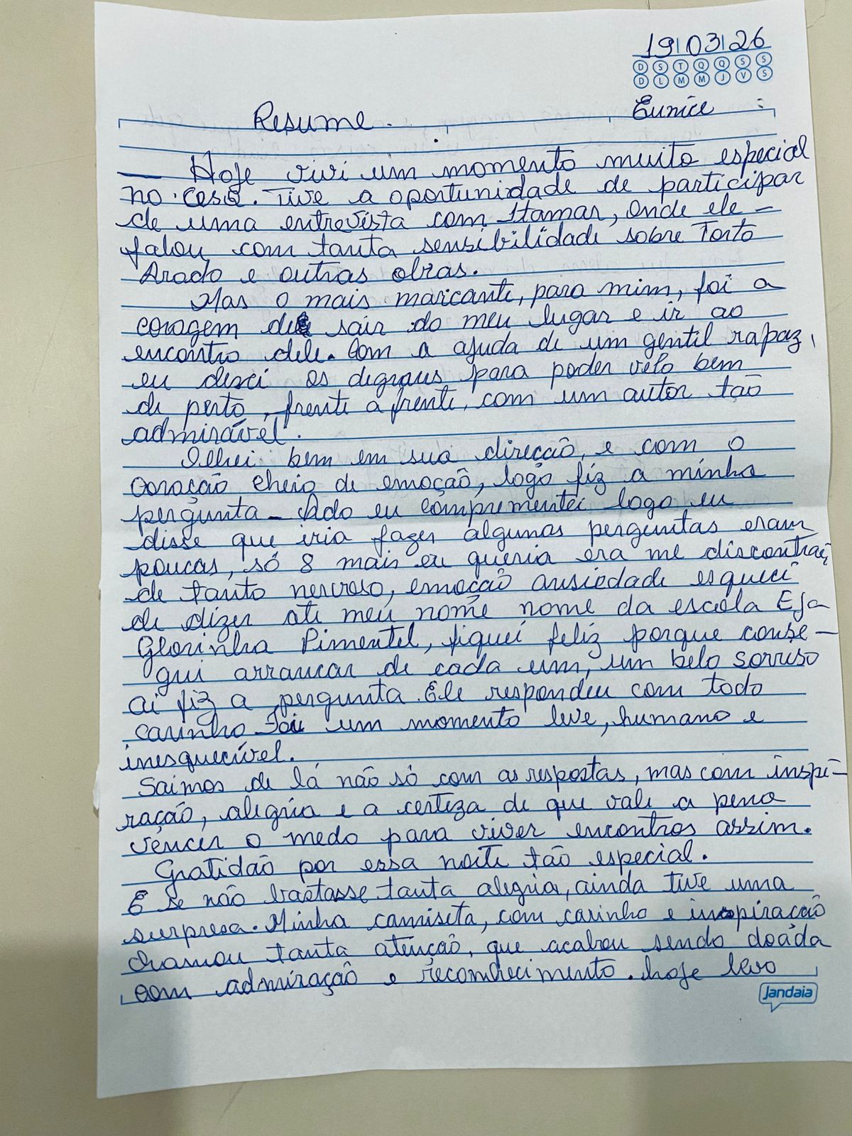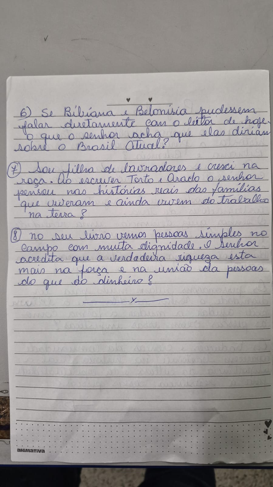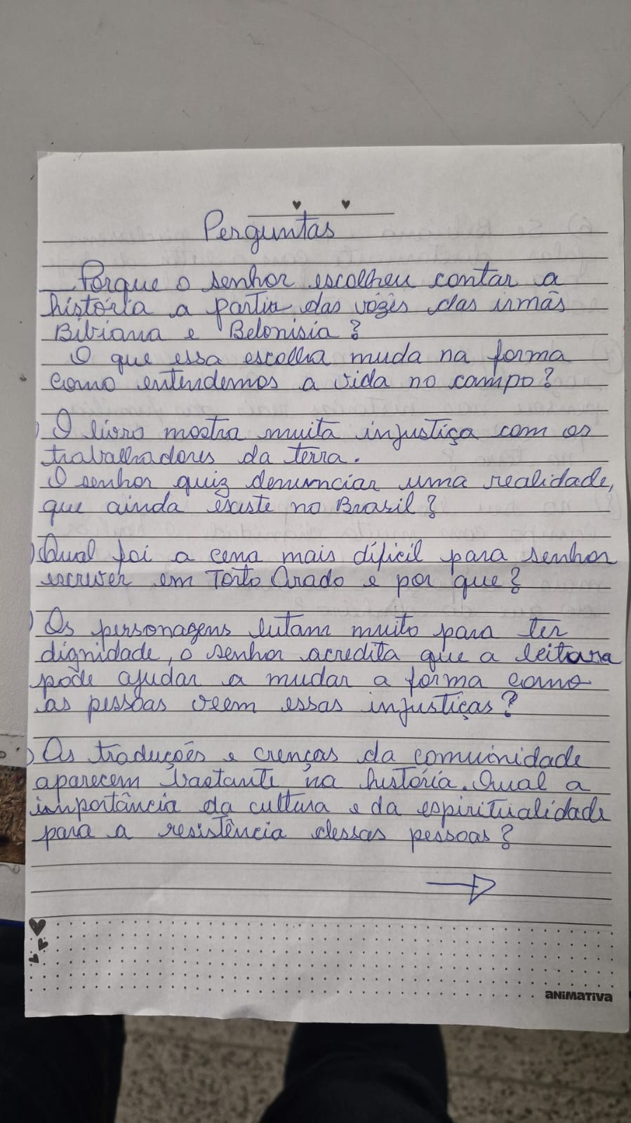 No decorrer do encontro, os educandos fizeram perguntas ao escritor. Antes de participar do evento, as turmas realizaram trabalhos com o livro Torto Arado, o que proporcionou rica oportunidade de reflexão sobre questões sociais, culturais e históricas do Brasil. Durante as atividades nas escolas, os educandos também exploraram temas como desigualdade, ancestralidade, identidade e a relação com a terra, presentes na obra.