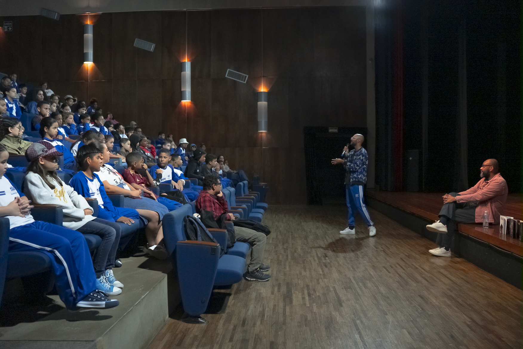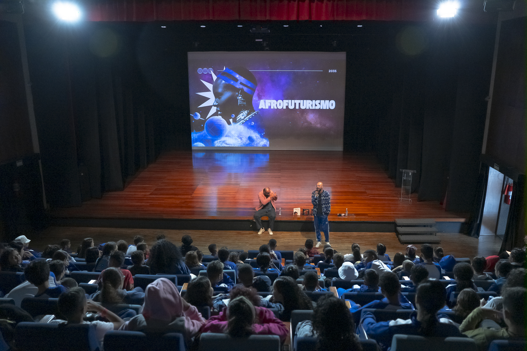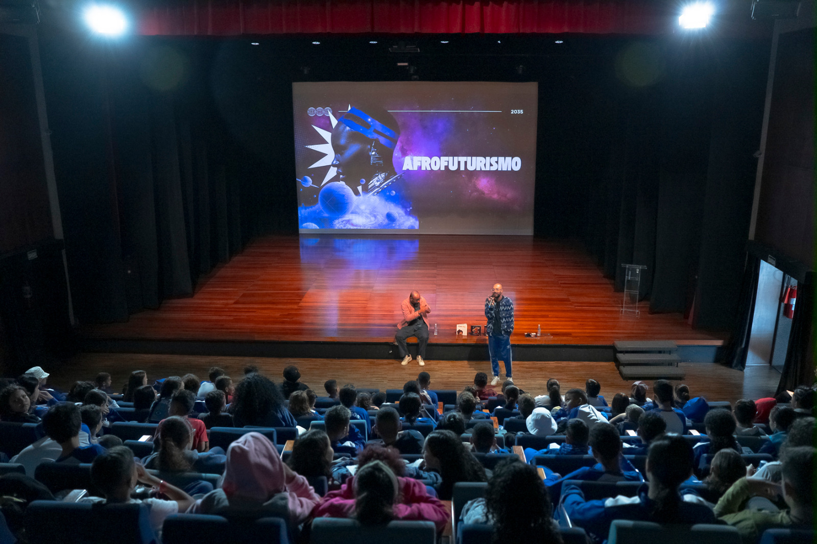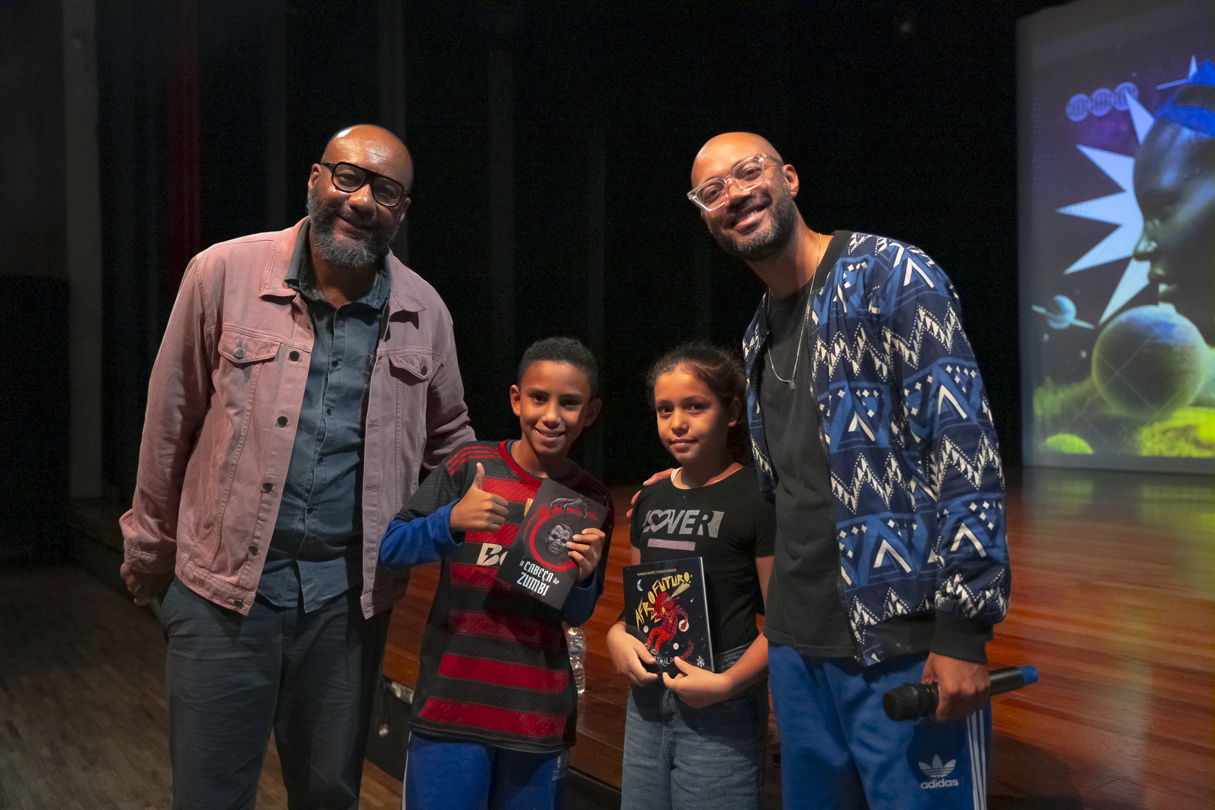 O encontro dos escritores com as turmas dos 5º anos da unidade escolar tratou sobre livros e histórias afrofuturistas, que encheu as crianças de curiosidades e ideias. Depois de mapearem as preferências de leitura e escrita dos alunos, os autores ampliaram a percepção que cada um deles sobre como construir histórias, desenvolver temáticas, criar personagens e narrativas relacionadas ao tema.