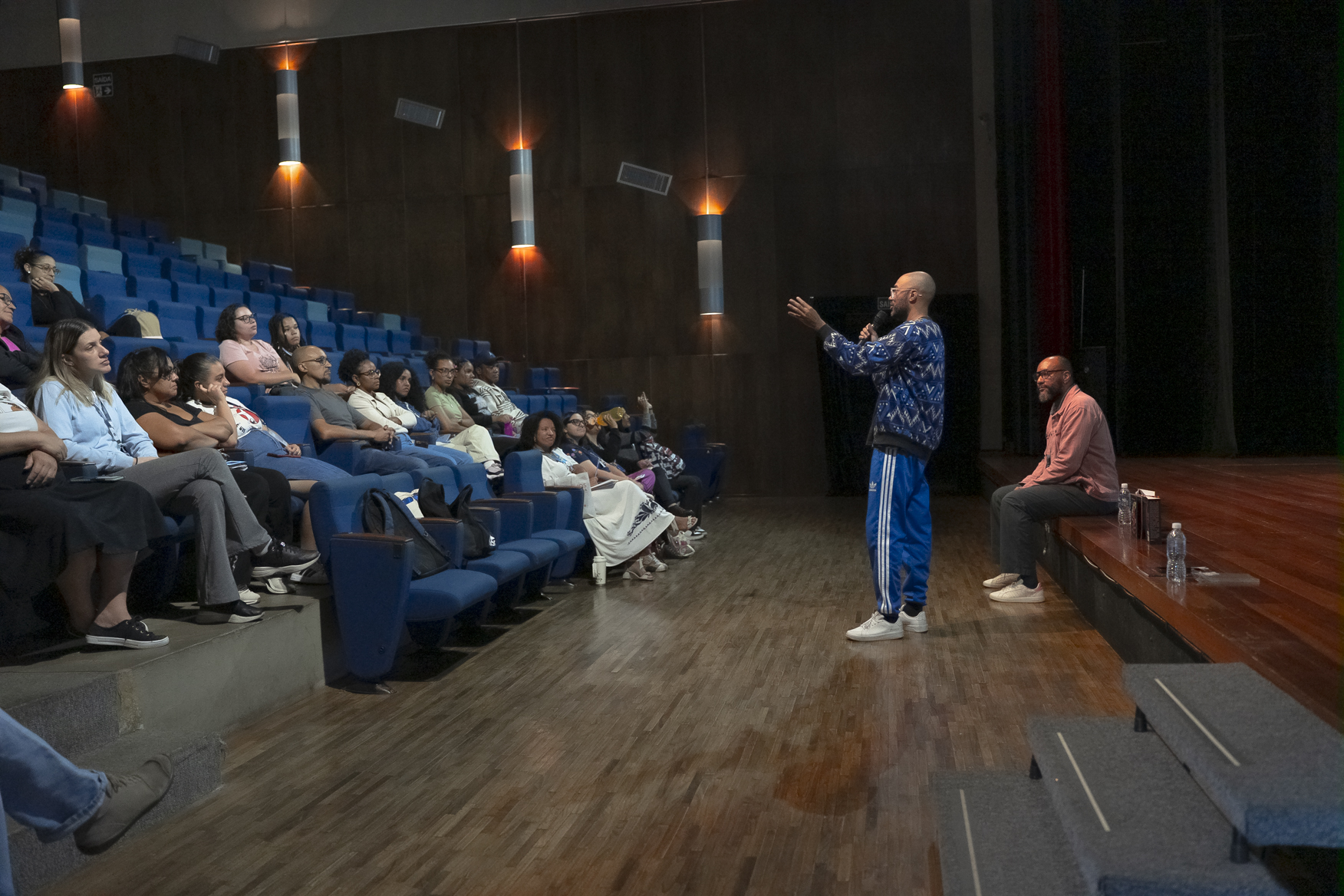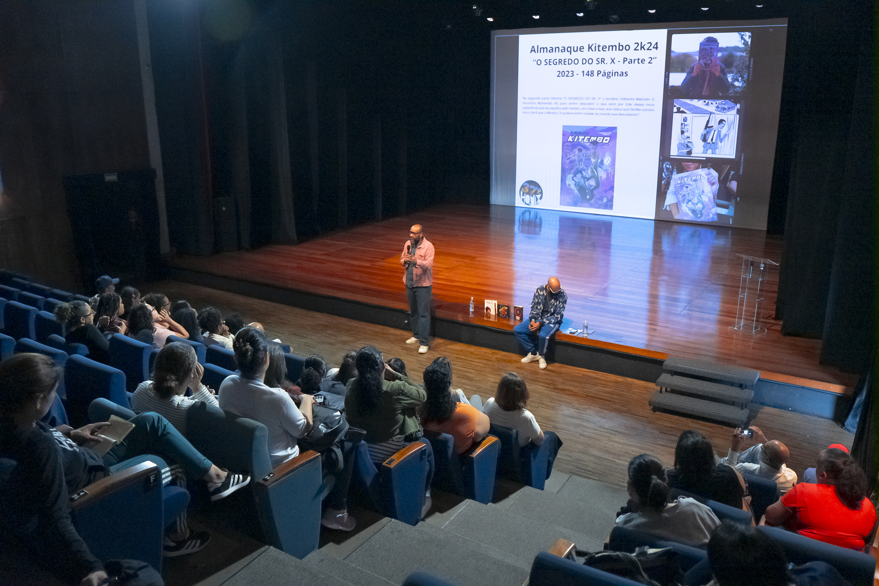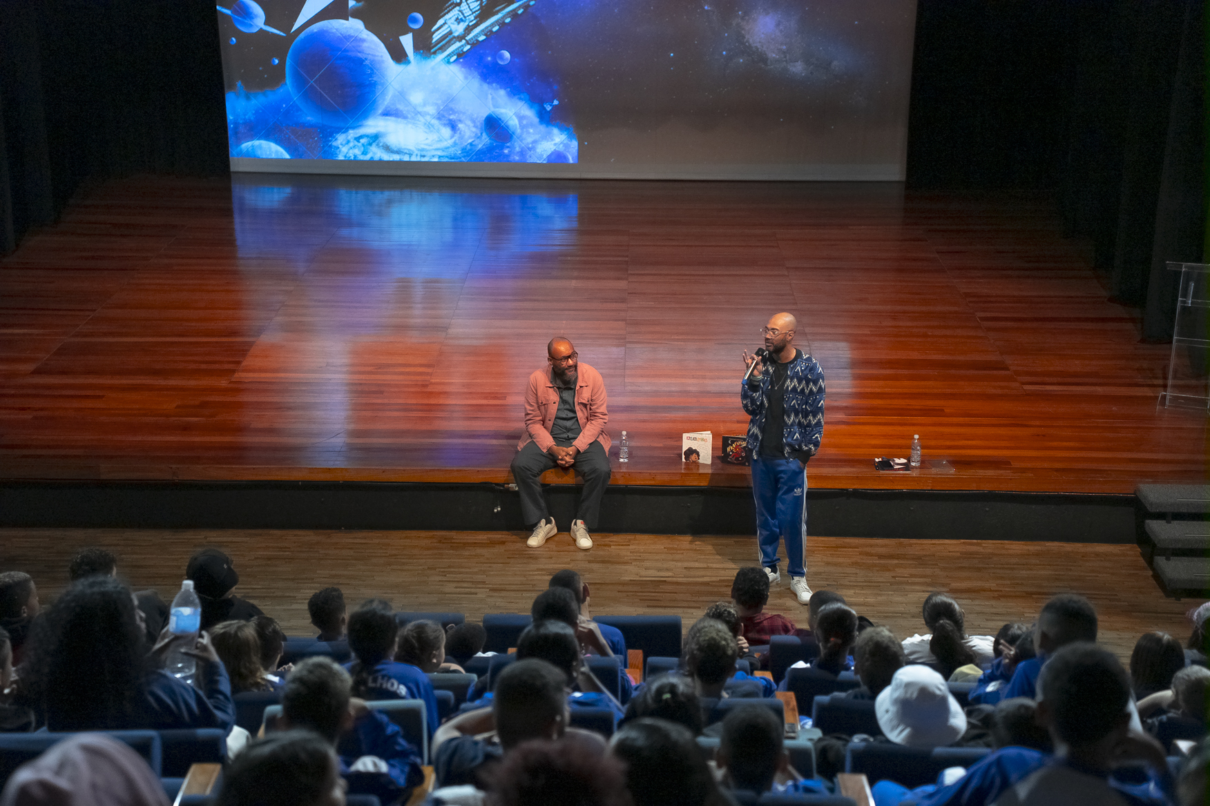 Professores e alunos da EPG Edson Nunes Malecka, no Jardim Ponte Alta, receberam na última sexta-feira (10), os escritores Henrique André e Israel Neto, autores da Editora Kitembo, para um bate-papo sobre literatura Afrofuturista infanto-juvenil. O encontro, que aconteceu no Teatro do CEU Ponte Alta, integra as ações do Literatura em Movimento, iniciativa da Secretaria de Educação para fomento ao livro e à literatura.
