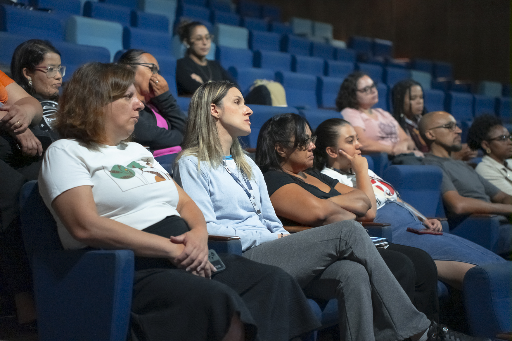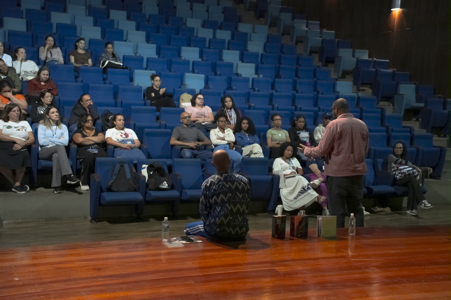 O encontro com o corpo docente aconteceu durante o horário de trabalho pedagógico (HTP) e proporcionou ao grupo reflexões sobre o modo como obras literárias afrofuturistas podem ser utilizadas em práticas pedagógicas e construções potentes.