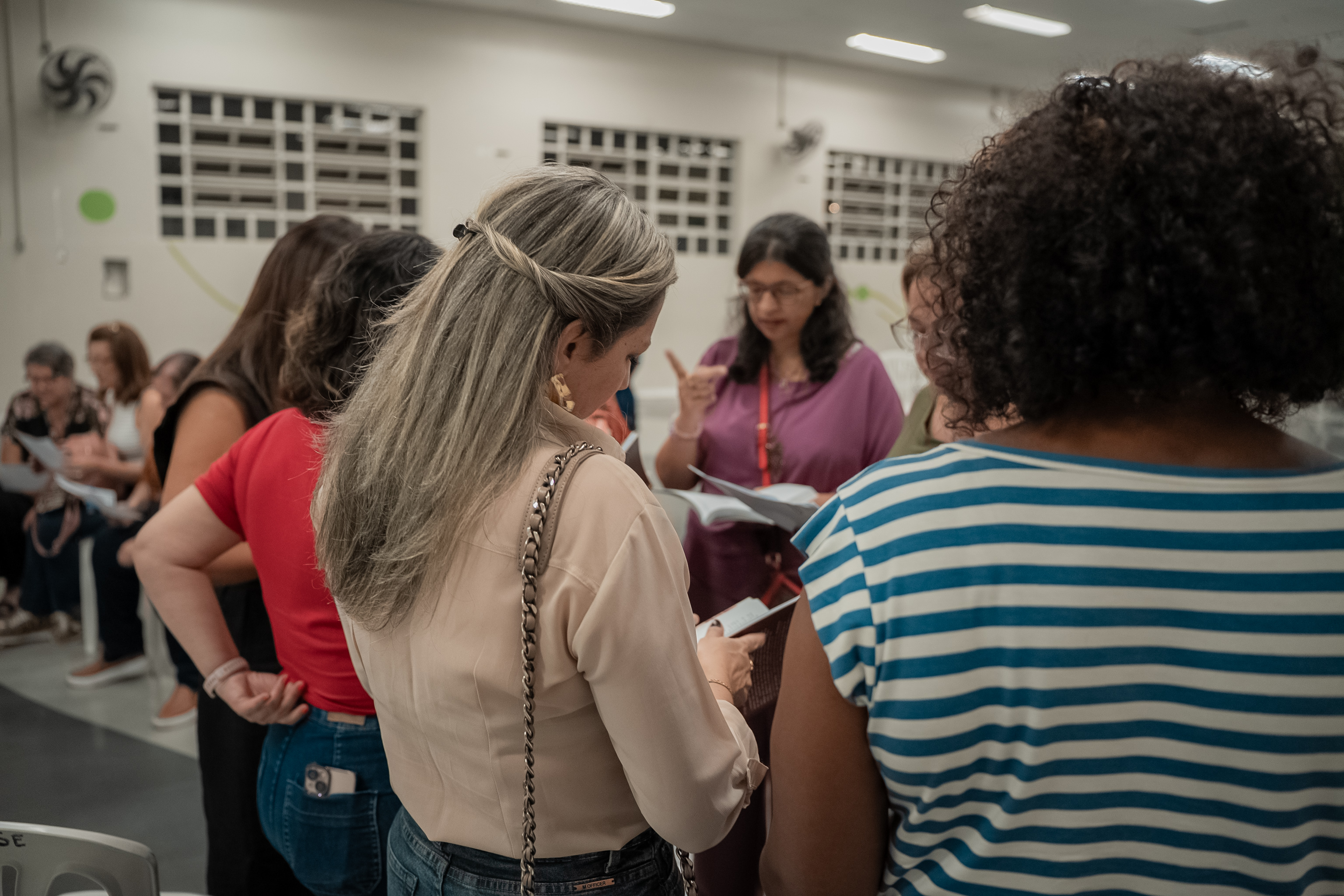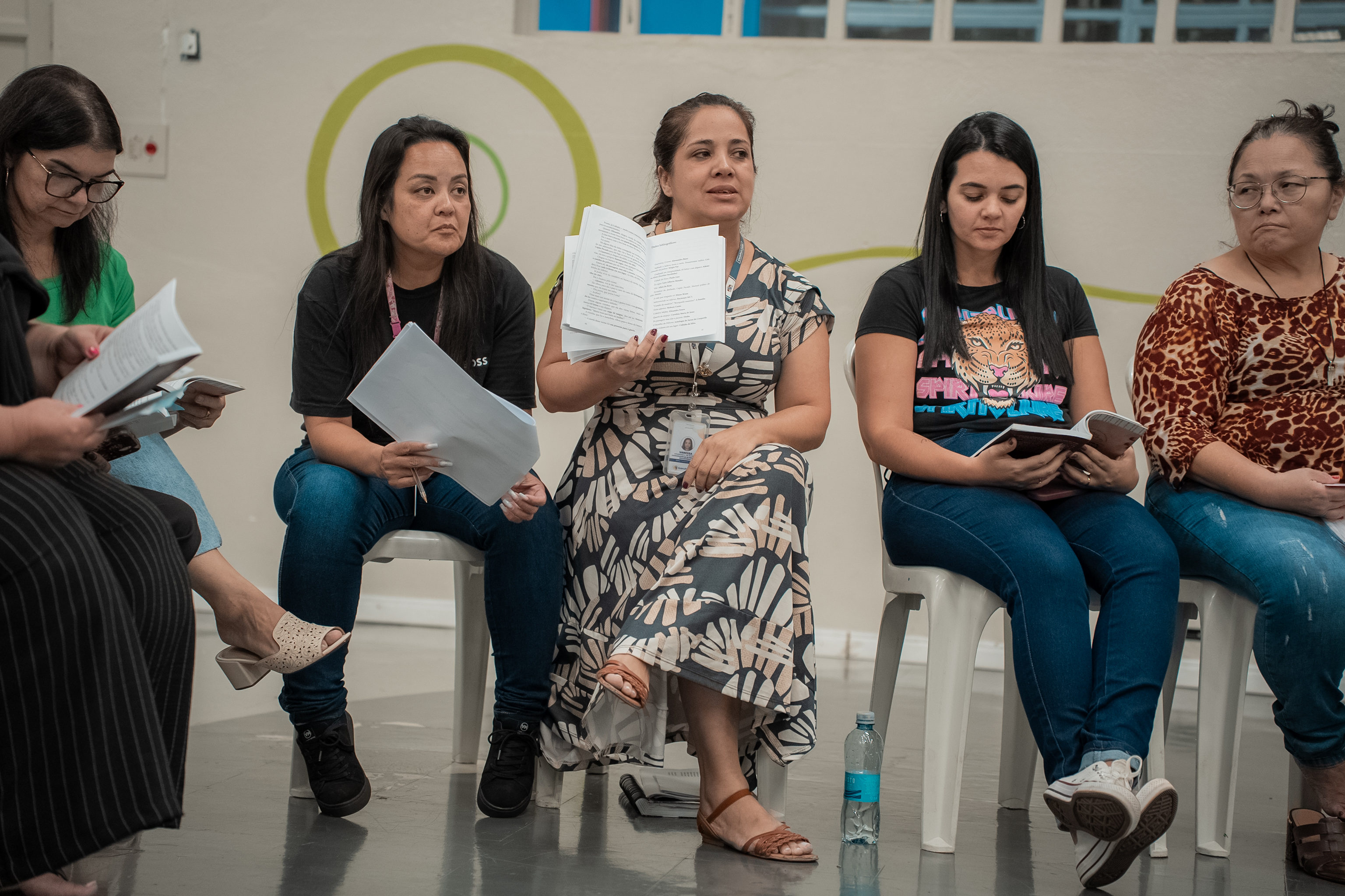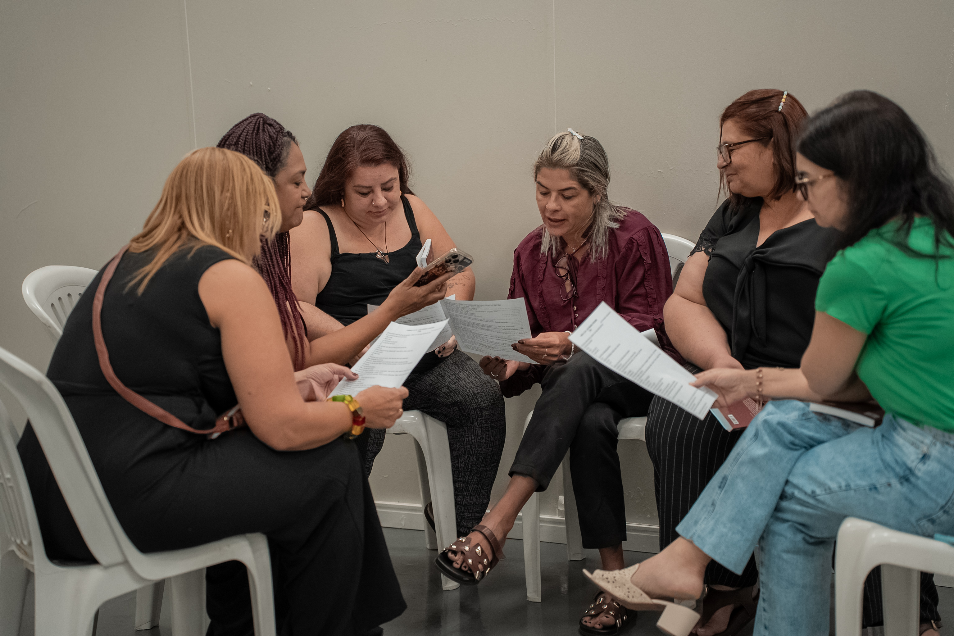 No auditório do Cemear, o grupo se reuniu para leitura colaborativa do texto A Poesia dos Deuses Inferiores, do poeta Sérgio Vaz. Os formadores também disponibilizaram diversos portadores textuais e os grupos tinham a missão de escolher textos desses portadores, realizar leituras e organizar entre os participantes a gravação dos textos escolhidos por meio de aplicativo de mensagens, socializando-os após a atividade.