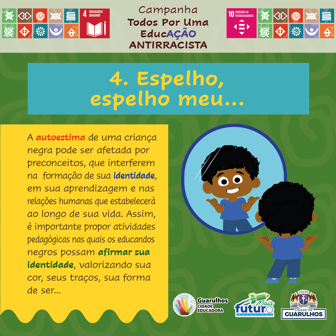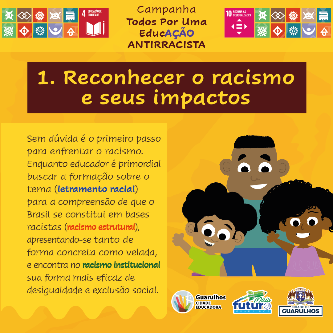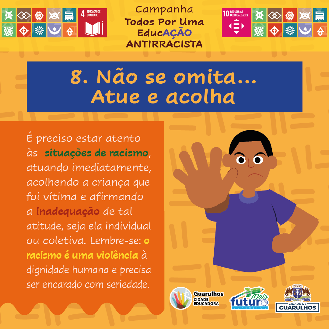 Os “8 Passos para uma Educação Antirracista” sistematiza pontos principais a serem considerados na escola. Chama a atenção para o fato de que a mudança começa no reconhecimento do racismo como uma grave violação de direitos, sobre a qual temos que agir, mostrando que nesta trajetória cada passo é importante.