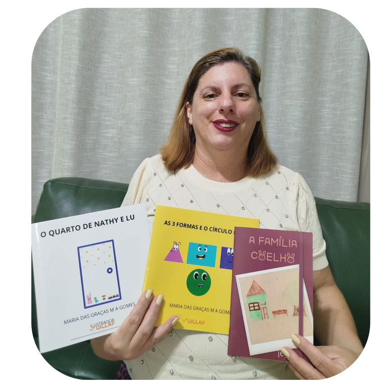 Maria das Graças Martino Alves Gomes nasceu em Belo Horizonte em 1976. Ela veio para Arujá em 2003, ingressando na rede de Guarulhos em 2017. Desde criança, sempre foi apaixonada por livros, passava horas e horas lendo e imaginando os cenários, os personagens e suas as aventuras e desventuras. Em 2012, formou-se em Pedagogia. Foi o trabalho com as crianças que a fez conhecer e apreciar o mundo da literatura infantil, e, sem dúvidas, o PACTO pela alfabetização na idade certa de Matemática a inspirou a escrever seu primeiro livro, lançado pela Ufscar : A família Coelho, livro que traz situações-problemas que desafiam as crianças a resolver as questões. Seu segundo livro é interativo, em que a criança faz as ilustrações, atentando-se às quantidades pedidas. O terceiro livro fala sobre as formas geométricas através de uma história divertida.