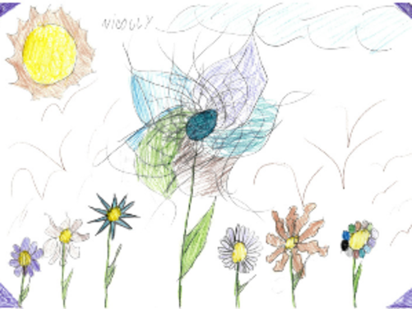 A criança se inspirou para realizar esse desenho no jardim da vizinha de sua casa. Relatou que sua mãe tem um jardim com flores, mas a vizinha tem mais flores e são mais bonitas. Através dos traços pude perceber o formato das letras da aluna que expressou seus sentimentos com os rabiscos. Esse desenho foi feito em casa como atividade prazerosa e ela estava passando por um conflito e teve a oportunidade de extravasar o que sentia com o desenho!